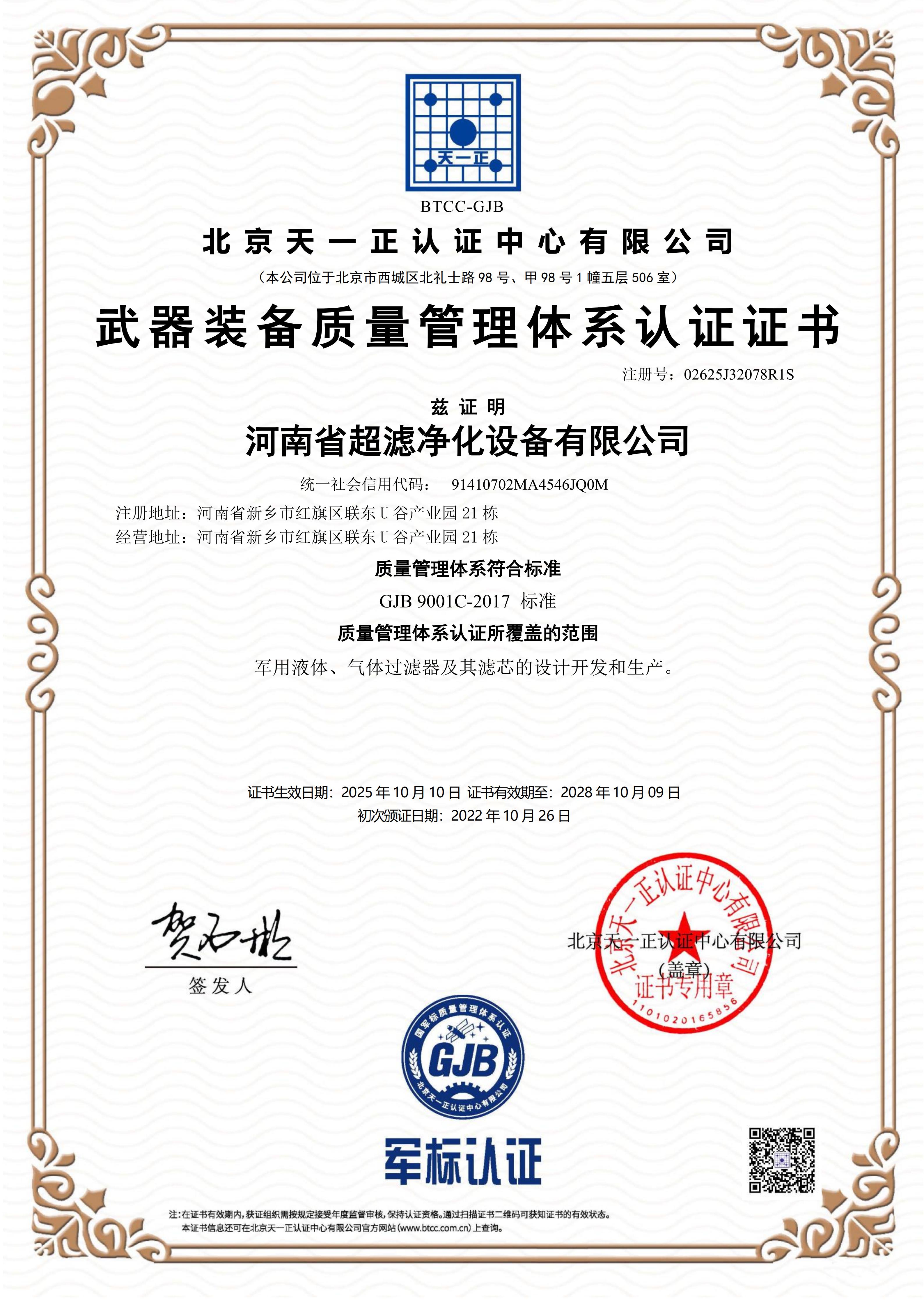 河南省超濾凈化設備有限公司成立于2018年,座落于河南省新鄉(xiāng)市,是一家集濾芯、過濾器、成套過濾裝置及液壓附件、液壓泵、特種閥等產(chǎn)品的研發(fā)、生產(chǎn)、銷售、技術服務為一體的綜合性企業(yè)。主要服務于國內(nèi)的航空、航天、船舶、核工業(yè)、煤碳、石油化工、電力、工程機械等行業(yè)。公司擁有2項發(fā)明專 利(ZL 2024 1 0110610.0 、ZL 20243 1 1806105.1)和6項實用新型專 利(ZL 202220053751.X、ZL202222784245.0、ZL202222578329.9、ZL202222630720.9、ZL202222864294.5、ZL202222712176.2),研發(fā)人員的不懈努力,銳意進取,加上經(jīng)驗豐富的技工與生產(chǎn)設備的結合,更好的產(chǎn)品技術使得質量有了更可靠的保障,保證了產(chǎn)品的及時交付,增強了企業(yè)的核心競爭能力。公司是過濾與分離行業(yè)協(xié)會會員單位,秉承“以質量求生存,靠創(chuàng)新謀發(fā)展”的指導思想,始終把產(chǎn)品質量放在前位,不斷進取,持續(xù)改進,精益求精,按照ISO9001標準建立了一套完善的質量保證管理體系,2022年通過了國 軍標《GJB9001C-2017》質量體系認證,使公司的產(chǎn)品質量得到提升,也將規(guī)范公司的管理,為客戶提供更多的、穩(wěn)定的高品質產(chǎn)品。2023年,公司獲得了高新 技術企業(yè)榮譽稱號。2024年,獲批成立新鄉(xiāng)市航天精密流體元件技術工程研究中心。
